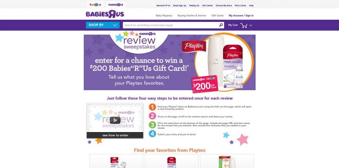 Since one month, moms and dads residing in the 50 United States and the District of Columbia are invited to review Playtex items at BabiesRUs.com for a chance to win $200 Babies R Us Gift Cards !