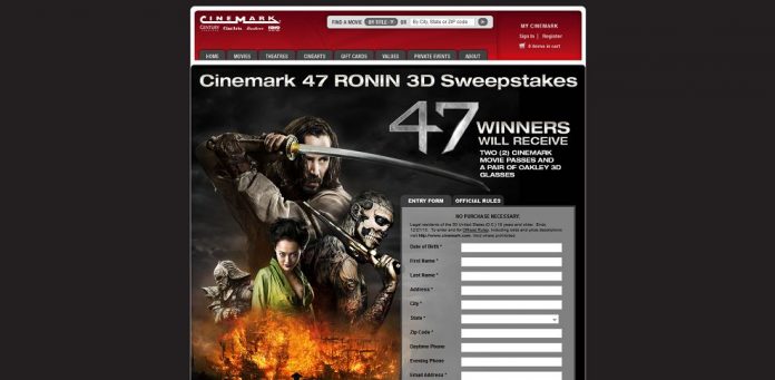 How To Enter : During the Promotion Period, visit http://www.cinemark.com, click on the Cinemark 47 Ronin 3D Sweepstakes prompt and follow the links and instructions to complete and submit the registration including a valid home address to receive one (1) entry into the Sweepstakes. P.O. Boxes are not permitted.